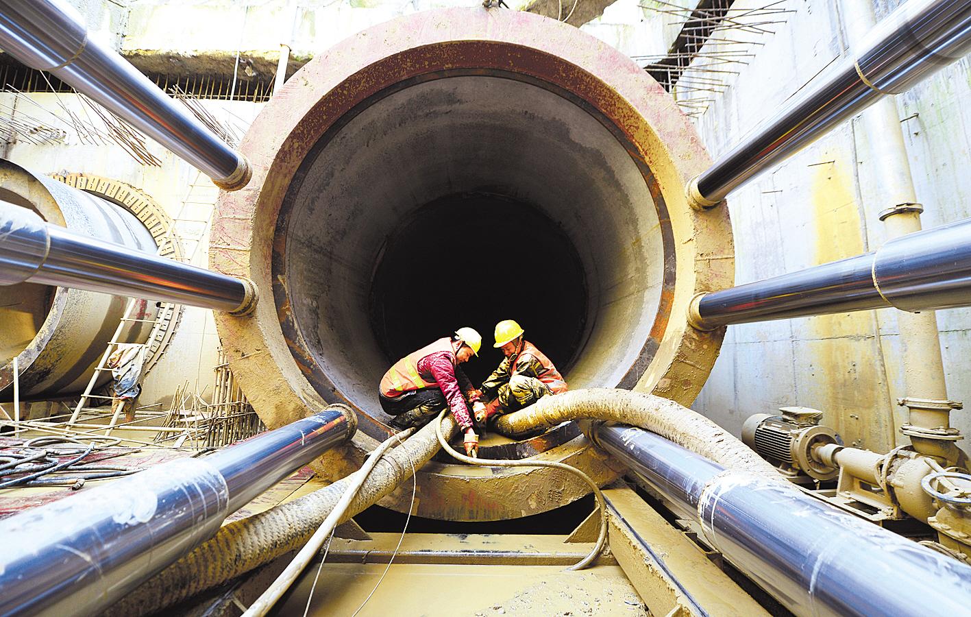 3月4日,襄陽市樊西綜合管廊一期工程施工現場,工人在做管道頂進完成后的收尾工作。