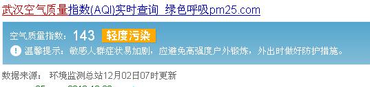 數據顯示,截至今日7時,武漢空氣質量指數143,屬于輕度污染。