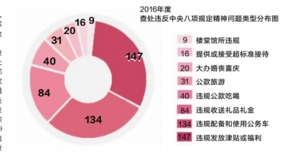 據(jù)介紹,2016年,違規(guī)發(fā)放津補(bǔ)貼或福利、違規(guī)配備和使用公務(wù)用車、違規(guī)收送禮品禮金等3類問題查處數(shù)量占查處問題總數(shù)的71.51%。同年,查處的隱形變異“四風(fēng)”問題占全年查處問題總數(shù)的11%,較2015年增長1.5個百分點(diǎn),主要表現(xiàn)為變相公款旅游、私車公養(yǎng)、擴(kuò)大范圍“搭車”發(fā)放津補(bǔ)貼等。