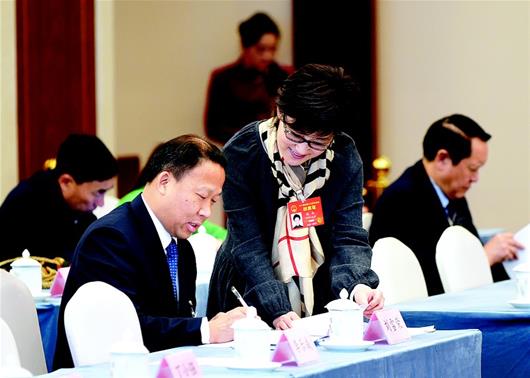 湖北日報訊 圖為7日,劉雪榮代表(左)和楊俊代表(右)在長江法的議案上進行聯名。 (全媒體記者 張朋 攝)