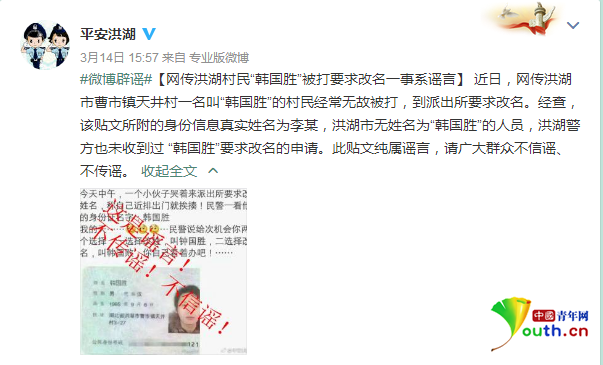 警方的辟謠微博顯示,近日,網(wǎng)傳洪湖市曹市鎮(zhèn)天井村一名叫"韓國勝"的村民經(jīng)常無故被打,到派出所要求改名。經(jīng)查,該貼文所附的身份信息真實(shí)姓名為李某,洪湖市無姓名為"韓國勝"的人員,洪湖警方也未收到過"韓國勝"要求改名的申請。此貼文純屬謠言,請廣大群眾不信謠、不傳謠。