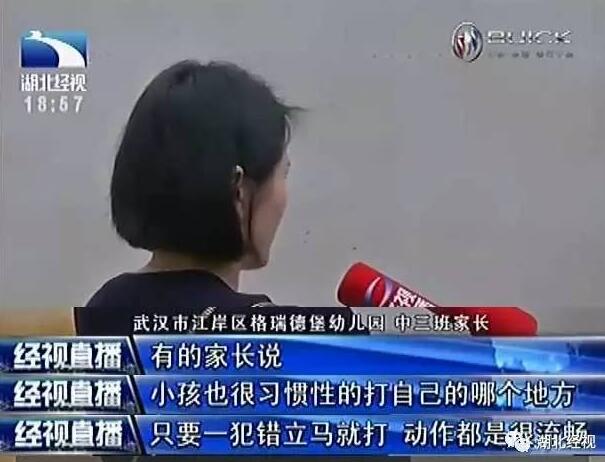 武漢市格瑞德堡幼兒園中三班家長:我帶小孩到去朋友家去玩,朋友就問我小孩你說你這調皮老師打不打你嗎?小孩說老師打。他說老師經常要他們自己掌嘴。