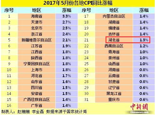 與全國水平相比,海南、天津、北京、浙江、新疆、江蘇、江西、陜西、寧夏、上海、河北、山東等12個省市5月份CPI同比漲幅超過全國水平。