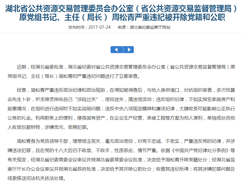 湖北省公共資源交易管理委員會辦公室(省公共資源交易監(jiān)督管理局)原黨組書記、主任(局長) 周松青嚴重違紀被開除黨籍和公職
