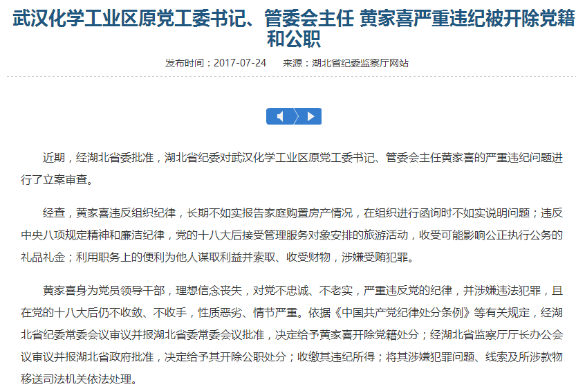 據(jù)湖北省紀委監(jiān)察廳網(wǎng)站7月24日通報: