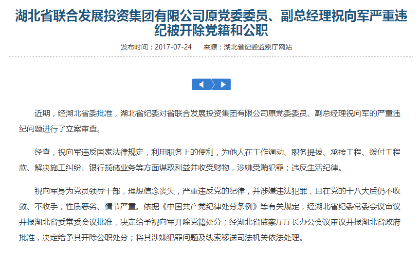 湖北省聯(lián)合發(fā)展投資集團有限公司原黨委委員、副總經(jīng)理祝向軍嚴重違紀被開除黨籍和公職