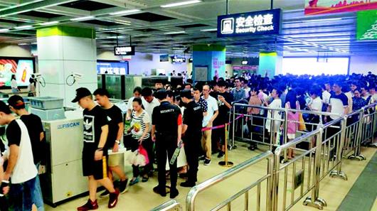 圖為:昨日18時(shí)23分,楚河漢街站內(nèi)站滿了等待安檢的市民
