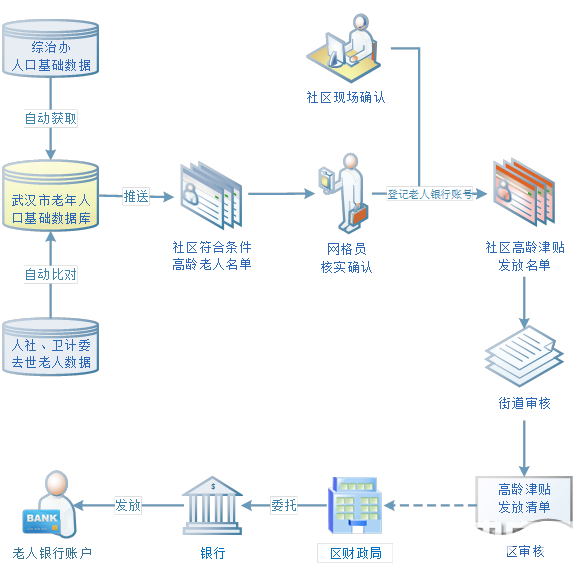 高齡津貼發放改革方面,從2018年1月1日起,武漢全市將依托養老服務信息平臺按季度發放高齡津貼。具體發放流程分為:第一步信息核查,武漢市養老服務信息平臺每季度末月將數據庫中的高齡老年人信息分配到社區(村),由網格員進行核查;第二步審核確認,街道(鄉鎮)核實確認高齡津貼發放清單后,于每季度末月的20日前提交給區民政局(老齡辦)審核;最后是資金發放,區財政局根據區民政局(老齡辦)審核確認的高齡津貼發放清單,將高齡津貼資金通過國庫集中支付到老人銀行賬戶上。