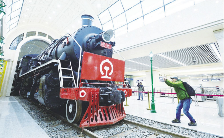 進入到地鐵6號線的大智路站點,首先映入眼簾的就是一個老式蒸汽火車頭,“這是目前為止進入到地鐵站點中最大最重的老物件。”來自北京城建院的設(shè)計師吳新宇介紹。