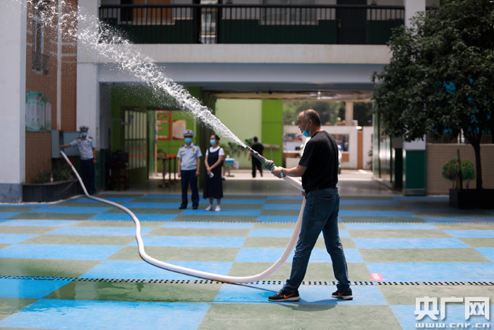 圖為:2020年8月28日,在湖北省武漢市漢陽(yáng)區(qū)楚才小學(xué),一名工作人員正在演示利用校內(nèi)消防設(shè)施快速滅火。(央廣網(wǎng)發(fā) 通訊員王方攝)