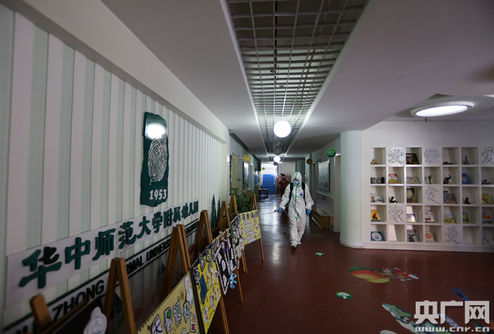 圖為:2020年8月28日,在湖北省武漢市華中師范大學(xué)附屬鐵橋幼兒園內(nèi),消防員正在對(duì)公共區(qū)域進(jìn)行全面消殺。(央廣網(wǎng)發(fā) 通訊員王方攝)