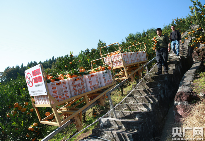 一箱箱新鮮的柑橘“乘坐”單軌運輸機,從橘園深處來到橘林外的通暢公路,打箱裝車,運往縣城或集鎮的物流點,運往山外的大中城市。