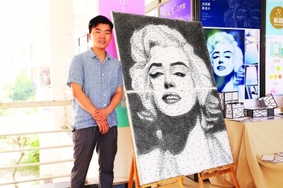 本報訊(記者楊佳峰 通訊員曾晗)昨天,武漢科技大學城市學院藝術學部優秀畢業設計展在該校展出。一幅由9000多顆釘子和線團制作的163cm×120cm 巨型瑪麗蓮·夢露肖像吸引了不少學生駐足拍照。