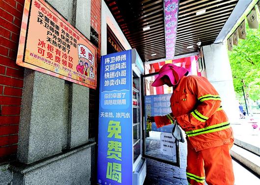 “戶外勞動者,天熱辛苦了”“冰柜有冷飲,可免費領取”……