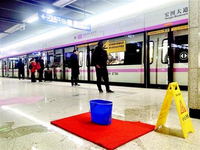 前日中午,陰雨綿綿。記者來到二七小路站,從B出口剛進入站廳,就看到一處漏水點,地面有一點潮濕,放著“小心滑倒”的提示牌。在候車站臺處,有三處漏水點,共擺放了5個桶和盆,桶下面還鋪了一張紅色地毯,防止乘客滑倒。