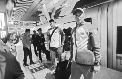 19點(diǎn)43分,列車緩緩進(jìn)站停穩(wěn),只見蒙古代表團(tuán)成員統(tǒng)一身著白藍(lán)紅三色的隊服下車。運(yùn)動員們拿著行李從D3出口出站,跟隨工作人員的指引來到一樓西出站口,5輛大巴車和4輛行李車在門口等候。談到乘坐高鐵的感受,蒙古運(yùn)動員紛紛稱贊中國高鐵的方便快捷、武漢的交通便利。