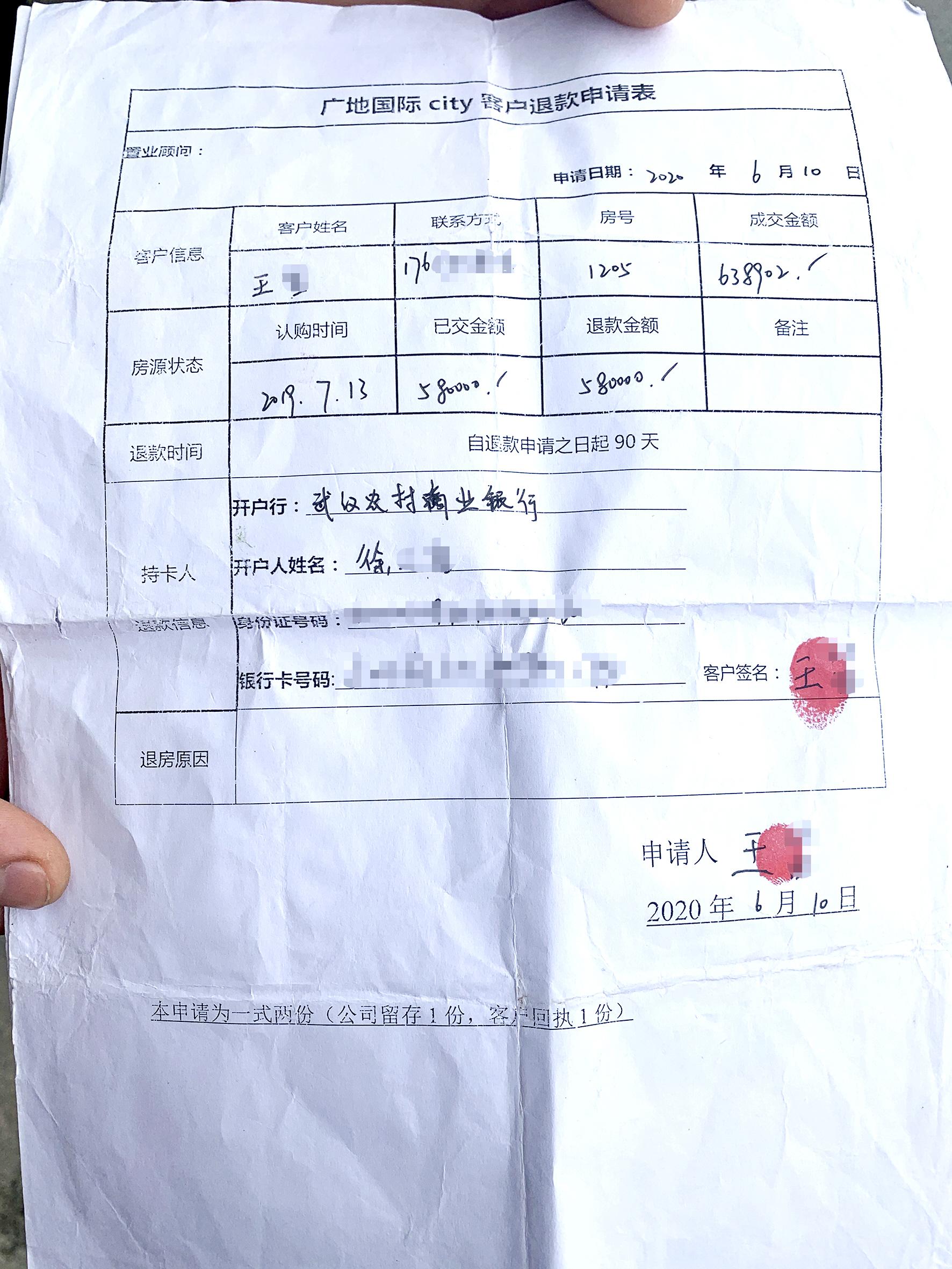 6月份,黃女士也簽下了退款申請表,她要求在申請表上蓋下公司公章。置業顧問告訴她,財務不上班,暫時不能蓋公章。超過退款時間后,黃女士曾多次聯系置業顧問,但對方一拖再拖,后來干脆不接電話。