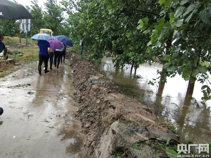 圖三:監利市遭遇持續強降雨,河渠水位普漲,當地筑起土壩阻擋洪水漫溢。央廣網發 記者左艾甫 攝