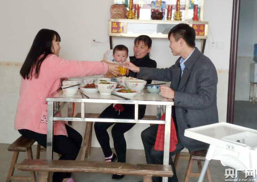 小譚家住在衡陽市郊,距離單位接近十五公里。因為考慮到兒子晚上要值乘,他家的年夜飯提前在下午5點開始。飯桌上,譚媽媽準備了滿滿一桌子菜。譚住寶以茶代酒敬了母親,扒了幾口飯,親了下尚在襁褓中的女兒后就撤,因為晚上他還要開工。 譚住寶家提前的年夜飯 -