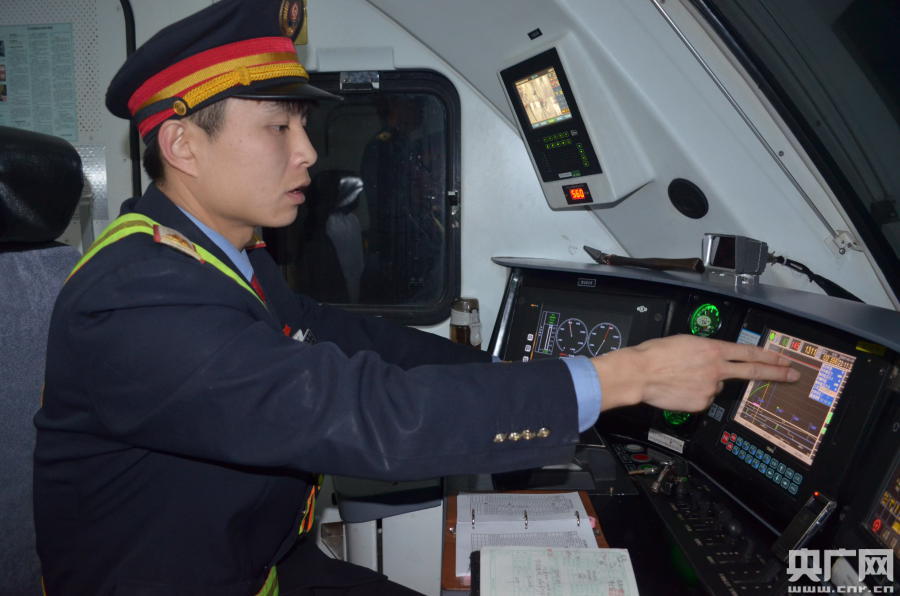 火車司機工作中除了需要精神高度集中,口、手、腳也不能閑著。一路上,每接近一架地面信號機,譚住寶便大聲呼喚信號顯示情況,右手做出手勢比對確認;通過車站時,用腳踩響鳴笛,一直忙個不停。這樣簡單卻又枯燥的動作,他一次出乘作業要重復超過300次。 譚住寶在執行標準化作業手勢 -