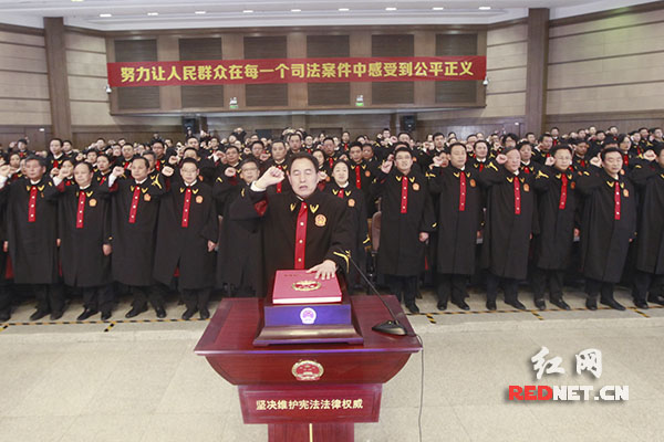 紅網長沙3月31日訊(時刻新聞記者 鄭濤 通訊員 曾妍)3月31日,湖南省人大常委會對省法院首批入額法官進行報備或任命后,湖南高院即舉行了首批入額法官暨新任審判員宣誓儀式。湖南高院和長沙、衡陽、懷化三個鐵路運輸法院共230名員額法官向憲法莊嚴宣誓。省人大常委會副主任、省法官檢察官遴選委員會主任謝勇監誓并講話,湖南高院黨組書記、院長康為民主持宣誓儀式。