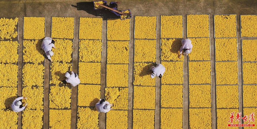11月3日,衡陽市南岳區壽岳鄉岳林村凰菊種植基地,菊農在晾曬菊花。金秋時節,該基地的600余畝高山凰菊進入收獲采摘期,當地菊農搶抓晴好天氣進行采摘、加工,確保凰菊的豐產增收。
