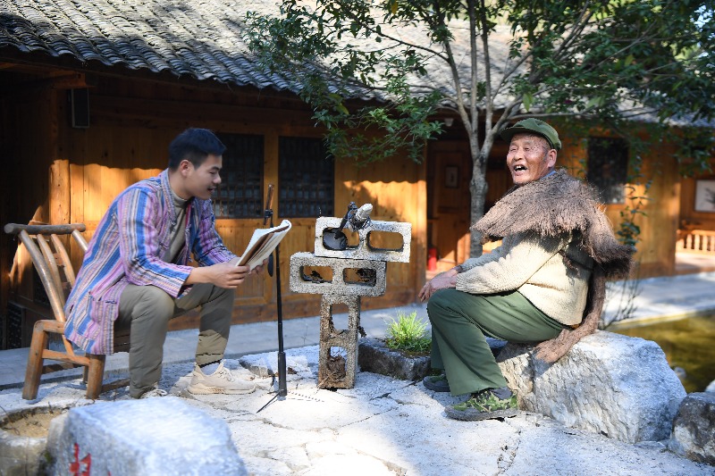 11月15日,彭國飛(右)和團(tuán)隊伙伴彭超文在湖南湘西芙蓉鎮(zhèn)錄制短視頻。2020年初,75歲的彭國飛參加村里辦的鄉(xiāng)村“網(wǎng)紅”培訓(xùn)班,并獲贈一臺智能手機(jī),遂開始了他的“網(wǎng)紅”生涯。飛爺爺和幾名“90后”組成團(tuán)隊,一起策劃、錄制短視頻,直播銷售農(nóng)產(chǎn)品。由于風(fēng)格突出、內(nèi)容有趣,作品在短視頻平臺獲得眾多網(wǎng)友點(diǎn)贊。