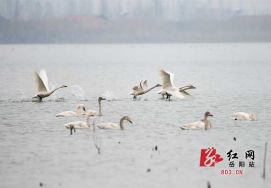 在東洞庭湖采桑湖管理站附近的湖面上,這里聚集了600多只小天鵝。記者看到,天空中還不時(shí)有三、五成群的小天鵝飛向這里,每當(dāng)有同伴到來(lái),湖面上的天鵝就會(huì)引吭高歌表示歡迎,并不停地點(diǎn)頭致意。