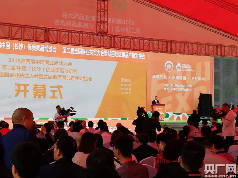 央廣網長沙9月27日消息(記者鄧文輝)9月27日,2018第四屆中國果業品牌大會、第二屆中國(長沙)優質果品博覽會、第二屆全國果業扶貧大會暨貧困地區果品產銷對接會(以下簡稱大會)在長沙紅星國際會展中心南廣場開幕,來自全國各地的領導嘉賓、專家學者,客商、種植大戶共同參加了開幕式,共商中國果業轉型升級、果業扶貧大計。
