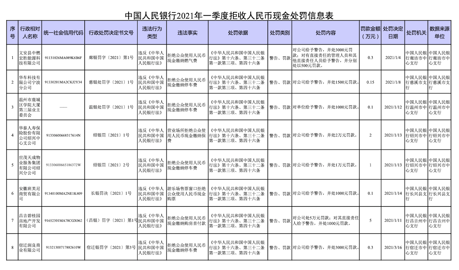 附:中國(guó)人民銀行2021年一季度拒收人民幣現(xiàn)金處罰信息表