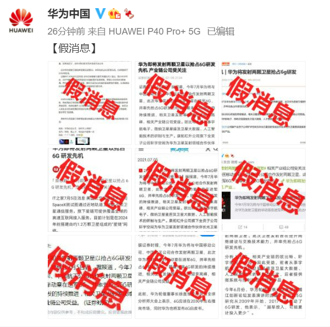 央廣網北京7月6日消息(記者 楊柳青)此前據媒體報道,今年7月華為將與中國移動公司、中國航天公司合作發射兩顆衛星,此次華為發射衛星的舉動意在進軍6G,并搶占6G研發先機。6日上午,華為中國官方微博辟謠,“華為即將發射兩顆衛星以搶占6G研發先機”為假消息。