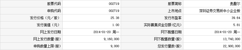 麥趣爾此次發行總數為2,290萬股,網上發行916萬股,發行市盈率39.64倍,申購代碼:002719,申購價格:25.38元,單一帳戶申購上限9,000股。