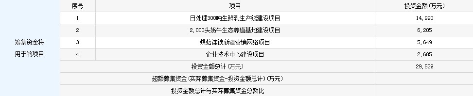 公司現有門店38家,計劃建設42家門店和6家中央工廠。本次募投項目為日處理300噸生鮮乳生產線(目前產能日處理100噸)、2000頭奶牛生態養殖基地建設、烘焙連鎖新疆營銷網絡和企業技術中心建設。
