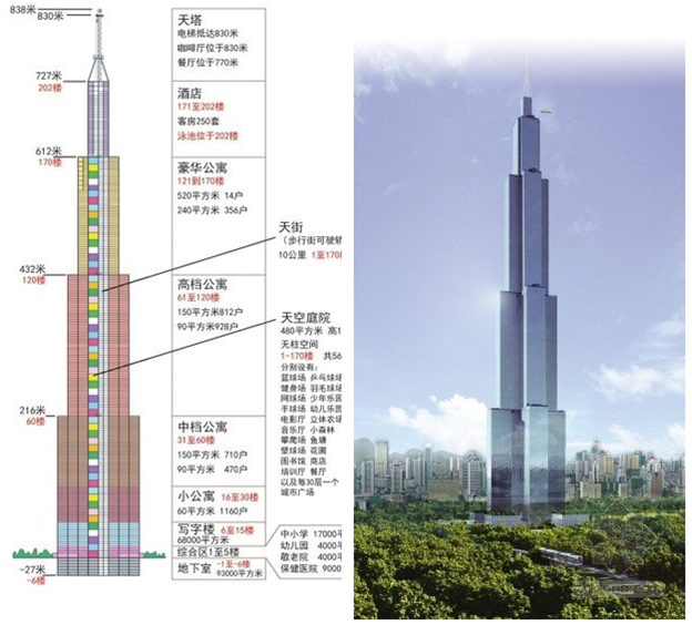 這部宣傳片列舉了一長串驚人數字:“天空城市”將建造838米,地上202層,地下6層,共計208層,超越迪拜哈里發塔(828米)成為世界第一高樓。項目凈占地30畝,建筑面積105萬平方米,9級地震不倒。