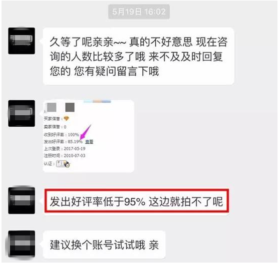 周小姐介紹,“她下單的時(shí)候,交易直接是關(guān)閉狀態(tài),直接沒(méi)法付款,下不了單。這是什么原因?客服明確跟她說(shuō),‘這是因?yàn)槟愫迷u(píng)率低于95%,所以不給下單。’后來(lái)我們了解到,不少淘寶上做得比較大的店鋪,都有類(lèi)似的做法。以前只是個(gè)例,最近集中爆發(fā)出來(lái)了。”