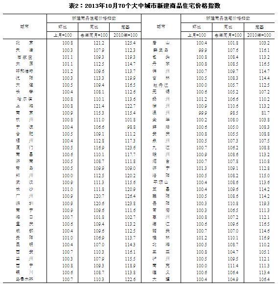 統(tǒng)計局發(fā)布了10月份70個大中城市住宅銷售價格變動情況。其中,新建商品住宅(不含保障性住房)價格與上月相比,70個大中城市中,價格下降的城市有2個,持平的城市有3個,上漲的城市有65個。環(huán)比價格變動中,最高漲幅為1.3%,最低為下降0.1%。