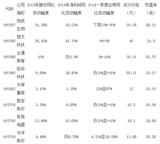 除已上市的紐威股份預計2013年凈利潤增長50%至70%外,今日深市上市的八只新股中,有兩家公司業績表現最佳。其中,“打新”時網上凍結資金最多的我武生物,其業績前景也較為亮眼:公司預計2013年營收、凈利潤增幅分別達31.25%和30.02%,兩者匹配度相當,對應規模為1.9億和近7000萬元。公司解釋,業績持續增長源于產品的技術含量及市場地位提高。同樣,面向醫藥行業的楚天科技2013年業績亦呈現明顯增長。公司主營水劑類制藥裝備的研發、生產和銷售,公司2013年產品銷售量價齊升,當年營收、凈利潤同比增幅分別達35.42%和41.7%。