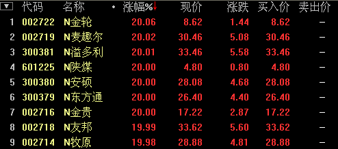 早盤9只新股全部"頂格"高開20%,金輪股份漲20.06%報8.62元,麥趣爾漲20.02%報30.46元,溢多利漲20.01%報33.46元,陜西煤業漲20.00%報4.80元,安碩信息漲20.00%報28.08元,東方通漲20.00%報26.40元,金貴銀業漲20.00%報17.22元,友邦吊頂漲19.99%報33.62元,牧原股份漲19.98%報28.88元。
