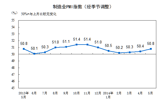2014年5月,中國制造業采購經理指數(PMI)為50.8%,比上月上升0.4個百分點,已連續3個月回升,預示我國制造業繼續穩中向好。