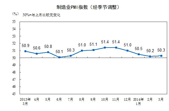 2014年3月,中國制造業采購經理指數(PMI)為50.3%,比上月微升0.1個百分點,是自去年11月份后首次回升,預示我國制造業總體平穩向好。