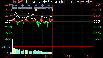 新華網消息 5日兩市早盤雙雙跳空高開,券商、保險、有色、煤炭等權重股活躍,盤中再創新高,隨后回落。滬指站穩2310點,盤中窄幅震蕩,深成指一度翻綠,創業板表現一般,震蕩下挫。截至午盤,滬指報2313.86點,上漲7點,漲幅0.3%,成交1063億元;深成指報8179.28點,上漲2.71點,漲幅0.03%,成交1216億元;創業板指報1484.75點,下跌10.76點,跌幅0.72%,成交234.9億元。