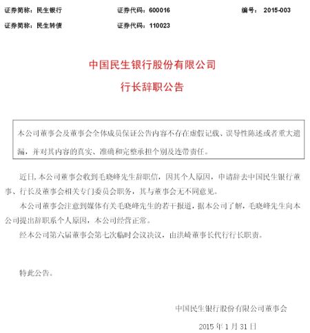 民生銀行31日在上交所發布公告稱,公司董事會收到毛曉峰辭職信,因其個人原因,申請辭去中國民生銀行董事、行長及董事會相關專門委員會職務。行長職責由洪崎董事長代行。