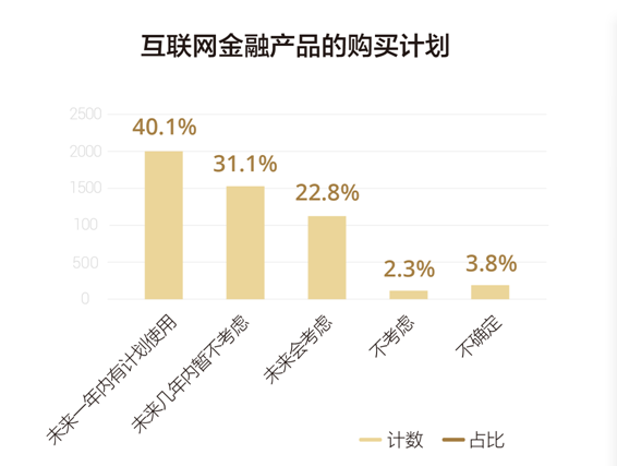 在互聯(lián)網(wǎng)金融深入千家萬戶的潮流之下,調(diào)查發(fā)現(xiàn):在未來一年內(nèi),有多達40.06%的大學(xué)生有意愿購買互聯(lián)網(wǎng)金融(服務(wù))。還有22.75%的大學(xué)生選擇了“未來,等互聯(lián)網(wǎng)發(fā)展成熟之后,會考慮使用互聯(lián)網(wǎng)金融產(chǎn)品(服務(wù))”。