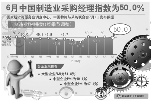 今天上午,國家統計局發布了今年6月份中國制造業采購經理人指數PMI數值為50.0%,比上月微降0.1個百分點,位于臨界點。