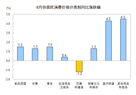 8月份,其他七大類價格同比六漲一降。其中,其他用品和服務、醫療保健、居住、衣著、教育文化和娛樂、生活用品及服務價格分別上漲4.5%、4.3%、1.5%、1.3%、1.3%、0.4%;交通和通信價格下降1.2%。