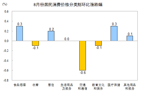 8月份,其他七大類價格環比三漲三降一平。其中,醫療保健、居住、其他用品和服務價格分別上漲0.3%、0.2%、0.1%;交通和通信、衣著、教育文化和娛樂價格分別下降0.6%、0.1%、0.1%;生活用品及服務價格持平。