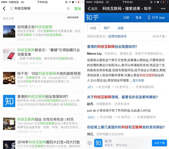 更重要的是,微信打通了多個內(nèi)容接口,通過"搜一搜"功能搜索到的內(nèi)容不再局限于朋友圈,比如知乎的內(nèi)容也可以直接通過這一功能搜索查看。