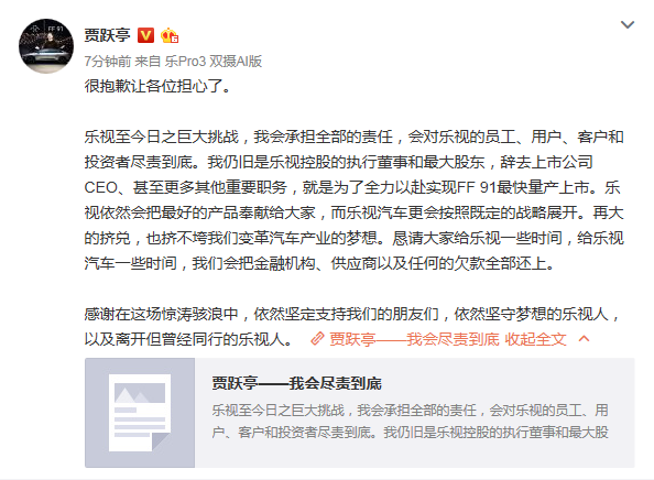 賈躍亭在微博上表示:樂視至今日之巨大挑戰(zhàn),我會承擔(dān)全部的責(zé)任,會對樂視的員工、用戶、客戶和投資者盡責(zé)到底。我仍舊是樂視控股的執(zhí)行董事和最大股東,辭去上市公司CEO、甚至更多其他重要職務(wù),就是為了全力以赴實現(xiàn)FF 91最快量產(chǎn)上市。樂視依然會把最好的產(chǎn)品奉獻(xiàn)給大家,而樂視汽車更會按照既定的戰(zhàn)略展開。再大的擠兌,也擠不垮我們變革汽車產(chǎn)業(yè)的夢想。懇請大家給樂視一些時間,給樂視汽車一些時間,我們會把金融機(jī)構(gòu)、供應(yīng)商以及任何的欠款全部還上。