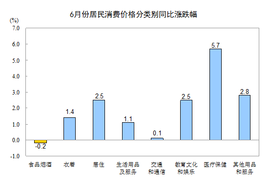 6月份,其他七大類價格同比均有所上漲。其中,醫療保健價格上漲5.7%,其他用品和服務價格上漲2.8%,居住、教育文化和娛樂價格均上漲2.5%,衣著、生活用品及服務、交通和通信價格分別上漲1.4%、1.1%和0.1%。