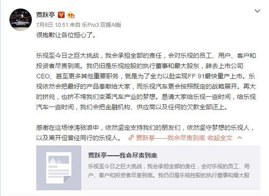 7月6日上午,樂視控股CEO、樂視網(wǎng)董事長(zhǎng)賈躍亭發(fā)布一封個(gè)人聲明,其在聲明中稱,"會(huì)對(duì)樂視的員工、用戶、客戶和投資者盡責(zé)到底。"而之所以辭去上市公司CEO,目的在于"全力以赴實(shí)現(xiàn)FF 91最快量產(chǎn)上市",同時(shí),"懇請(qǐng)大家給樂視一些時(shí)間,給樂視汽車一些時(shí)間,我們會(huì)把金融機(jī)構(gòu)、供應(yīng)商以及任何的欠款全部還上"。